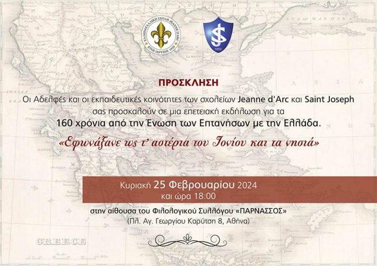 Οι Αδελφές και οι εκπαιδευτικές κοινότητες των σχολείων Jeanne d'Arc και Saint Joseph σας προσκαλούν σε μια επετειακή εκδήλωση για τα 160 χρόνια από την Ένωση των Επτανήσων με την Ελλάδα.