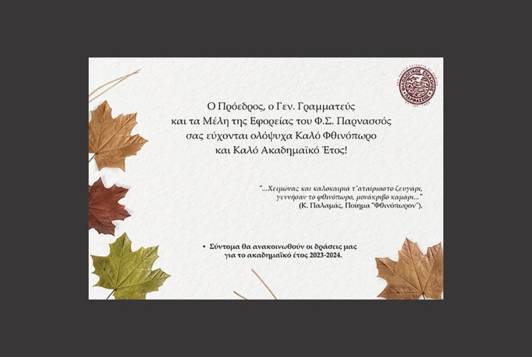 Ο Πρόεδρος, ο Γεν. Γραμματεύς και τα Μέλη της Εφορείας του Φ.Σ. Παρνασσός σας εύχονται ολόψυχα Καλό Φθινόπωρο και Καλό Ακαδημαϊκό Έτος!