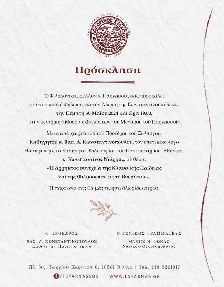 Μετὰ ἀπὸ χαιρετισμὸ τοῦ Προέδρου τοῦ Συλλόγου, Καθηγητοῦ κ. Βασ. Λ. Κωνσταντινόπουλου, τὸν ἐπετειακὸ λόγο θὰ ἐκφωνήσει ὁ Καθηγητὴς Φιλοσοφίας τοῦ Πανεπιστημίου Ἀθηνῶν, κ. Κωνσταντῖνος Νιάρχος, μὲ θέμα: «Ἡ ἄρρηκτος συνέχεια τῆς Κλασσικῆς Παιδείας καὶ τῆς Φιλοσοφίας εἰς τὸ Βυζάντιον».