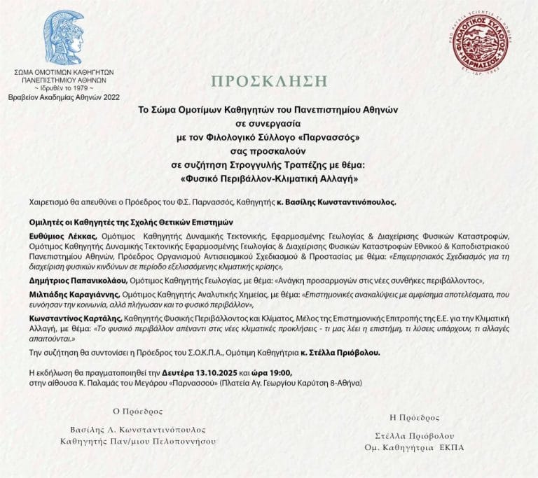 Το Σώμα Ομοτίμων Καθηγητών του Πανεπιστημίου Αθηνών σε συνεργασία με τον Φιλολογικό Σύλλογο «Παρνασσός» σας προσκαλούν σε συζήτηση Στρογγυλής Τραπέζης με θέμα: «Φυσικό Περιβάλλον-Κλιματική Αλλαγή».