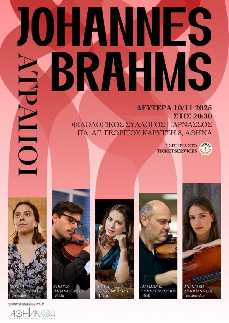 Πέντε διακεκριμένοι σολίστες με διεθνείς διακρίσεις, απόφοιτοι μουσικών Ακαδημιών της Γερμανίας, οδηγούν τον ακροατή σε αγαπημένες μαγευτικές ατραπούς του μεγάλου Γερμανού συνθέτη Johannes Brahms παρουσιάζοντας ένα καλλιτεχνικό πρόγραμμα ιδιαίτερων μουσικών απαιτήσεων.