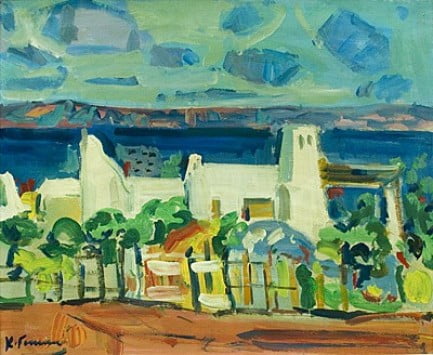 Περιγραφή : Τοπίο κοντά στη θάλασσα, με πρωταγωνιστή ένα λευκό σπίτι. Το έργο υπάγεται στο ρεύμα των φώβ, με έμφαση στη χρωματική ύλη: ανοιχτά, ζεστά κεραμιδί, βαθιά μπλε και ανοιχτότερα γαλάζια, τονικότητες πράσινου με δυνατό κίτρινο περιβάλλουν το λευκό του σπιτιού. Η φαινομενική αταξία της περίφραξης με την πλούσια βλάστηση βασίζεται σε άρτιο σχέδιο, όπως αποδεικνύει η κλασική δομή και η σχεδιαστική ισορροπία του έργου.