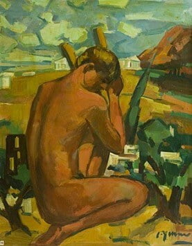 Περιγραφή : Σύνθεση μυθολογικού περιεχομένου, στο πλαίσιο των μεταϊμπρεσιονιστικών τάσεων, ισχυρής χρωματικής δυναμικής και αξιόλογης τεκτονικής σύνθεσης, όπου κυριαρχεί η καθιστή γυμνή ανδρική μορφή, τοποθετημένη σε ένα υπαίθριο, αρχαιοπρεπές περιβάλλον. Η χρωματική απόδοσή της, τολμηρή, αντιρεαλιστική και για το λόγο αυτό εντυπωσιακή, συνάδει με τα μη αληθοφανή χρώματα του λόφου και του ουρανού στο βάθος, ενισχύοντας τη διάσταση της μυθολογικής αναφοράς του έργου.