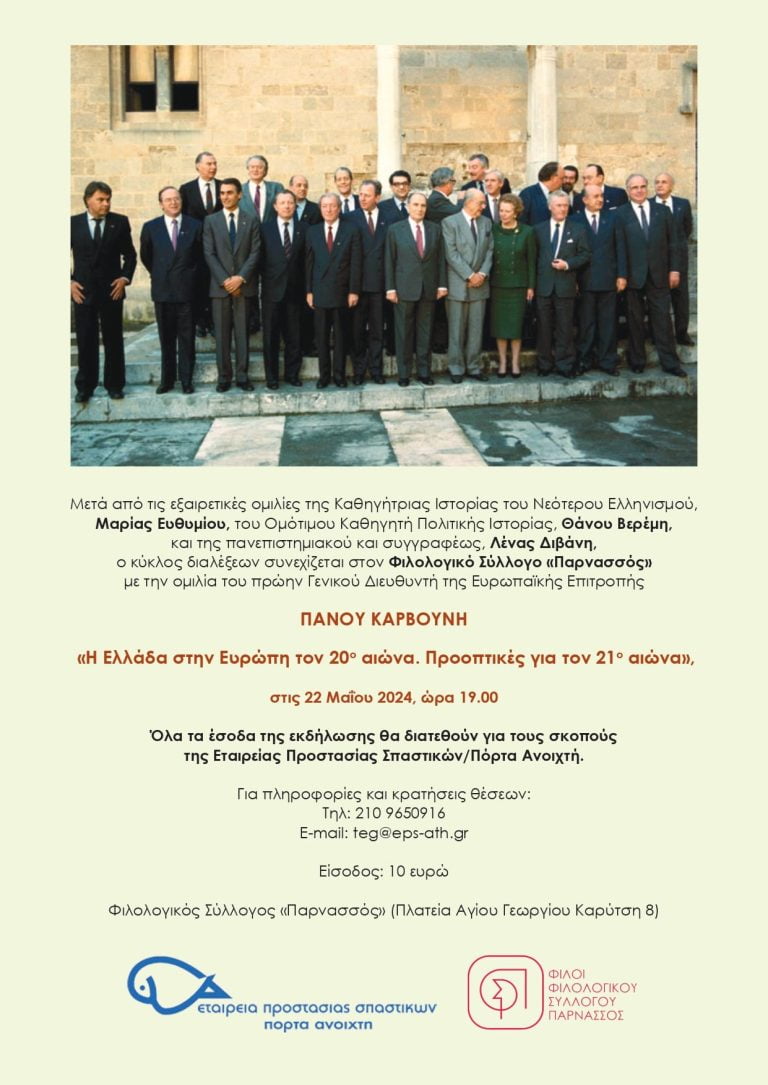 Με την ομιλία του πρώην Γενικού Διευθυντή της Ευρωπαϊκής Επιτροπής, Πάνου Καρβούνη, συνεχίζεται ο κύκλος διαλέξεων που διοργανώνει η Εταιρεία Προστασίας Σπαστικών/Πόρτα Ανοιχτή , σε συνεργασία με τους Φίλους του Φιλολογικού Συλλόγου «ΠΑΡΝΑΣΣΟΣ», όπου επιστήμονες, μεγάλου κύρους, αναλύουν γνωστές και άγνωστες πτυχές της ελληνικής, ευρωπαϊκής και παγκόσμιας ιστορίας του 20 ου αιώνα.