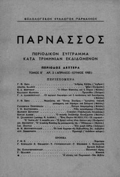 “ΠΑΡΝΑΣΣΟΣ” ΠΕΡΙΟΔΙΚΟΝ ΣΥΓΓΡΑΜΜΑ ΚΑΤΑ ΤΡΙΜΗΝΙΑΝ ΕΚΔΙΔΟΜΕΝΟΝ-ΠΕΡΙΟΔΟΣ ΔΕΥΤΕΡΑ, ΤΟΜΟΣ Β’, ΑΡΙΘΜΟΣ 2 (ΑΠΡΙΛΙΟΣ-ΙΟΥΝΙΟΣ 1960)
