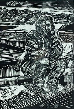 Περιγραφή : Με αφετηρία τον εξπρεσιονισμό, ο χαράκτης αφομοιώνει κυβιστικά στοιχεία, κινούμενος σε περιοχές κοντά στο ναϊβισμό, σε μια σύνθεση όπου η εύρωστη γυναικεία φιγούρα αποτελεί το κέντρο του ενδιαφέροντος του καλλιτέχνη, υπερμεγέθης σε σύγκριση με το περιβάλλον της, νοηματοδοτώντας το αλλότριο τοπίο, αναιρώντας και ταυτόχρονα επιτείνοντας την απόκοσμη μοναξιά που η στάση της υποβάλλει.