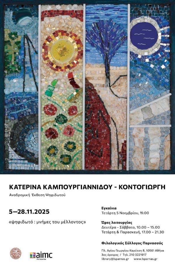 Στην αίθουσα τέχνης του Φιλολογικού Συλλόγου Παρνασσός παρουσιάζεται η τελευταία έκθεση της εικαστικού Κατερίνας Καμπουργιαννίδου-Κοντογιώργη, η οποία εστιάζει στην πορεία της, από τα κλασσικά ψηφιδωτά μέχρι τα σύγχρονα.