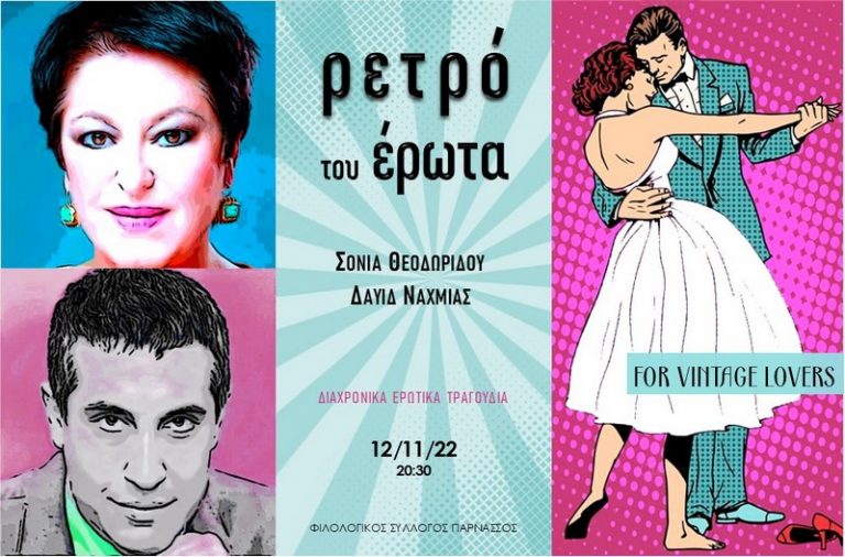 Η αξεπέραστη ερμηνευτική προσέγγιση της Σόνιας Θεοδωρίδου και το πιάνο του Δαυίδ Ναχμία συνδυάζονται για πρώτη φορά με σύγχρονα multimedia και δημιουργούν ένα μοναδικό αποτέλεσμα που αφορά κάθε γενιά! Πολυμελής χορευτική ομάδα θα συνοδεύσει το ταξίδι μας στο ερωτικό μουσικό σύμπαν μιας άλλης εποχής! Ερωτευμένοι ή όχι, αξίζει να έρθετε το Σάββατο, 12 Νοεμβρίου στις 20:30, στον Φιλολογικό Σύλλογο ΠΑΡΝΑΣΣΟΣ, στην πλατεία Καρύτση, στο κέντρο της Αθήνας.