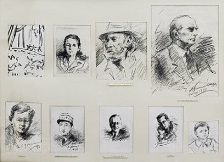 Σύνολο 9 σχεδίων, πρωτότυπα και αναπαραγωγές πρωτοτύπων. α. Βακχικό, 0,21 x 0,16, 1968. β. Κορίτσι, 0, 17 x 0,12, 1993 (Το αρχικό βρίσκεται στο Μουσείο της πόλης ΑRRAS και φέρει χρονολογία 1948). γ. Το τελευταίο σκίτσο του Γιάννη Τσαρούχη, 0,26 x 0,19, (Μαρούσι 1987). δ. Ο Κωνσταντίνος Καραμανλής, 0,33 x 0, 24, Paris, 1968. ε. Ο ανιψιός μου, 0,14 x 0,19, 1956 (Το αρχικό βρίσκεται στη συλλογή Χαράς Δαβαράκη). στ. Ο στρατηγός De Gaule, 0,18 x 0,13, 1948 (αναπαραγωγή αρχικού). ζ. Φρ. Ρούσβελτ, 0,18 x 0 ,13, 1947 (Λευκός Οίκος)-αναπαραγωγή αρχικού. η. Κεφάλι νέου, 0,18 x 0,13, 1949 (αναπαραγωγή αρχικού). θ. Ο εγγονός μου ο Πάνος, 0,12 x 0,11, 1991(αναπαραγωγή αρχικού). Στα σχέδια γ, δ, ε, ζ, η υπάρχει μεταγενέστερη επέμβαση με μολύβι ή κάρβουνο.