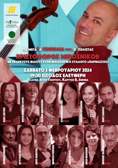 Αγαπητές φίλες και φίλοι, σας περιμένουμε στη συναυλία γενεθλίων του σολίστ Χριστόφορου Μιρόσνικοβ που μαζί με τους εκλεκτούς φίλους και διακεκριμένους καλλιτέχνες Ντόρα Μπακοπούλου, Νατάλια Μιρόσνικοβα, Natasha Korsakova, Manrico Padovani, Νίκο Μάνδυλα, Ηλία Σδούγκο, Έλενα Χούντα, Κρυσταλία Γαϊτάνου, Νίκο Καβάκο, Πόπη Μαλαπάνη, Μανώλη Παπασιφάκη, αλλά και την σοπράνο Μαρία Ηλιάνα Κατσούρα θα ερμηνεύσουν έργα των Bach, Vivaldi, Brahms, Schumann, Tchaikovsky, Stravinsky, Σκαλκώτα, Piazzolla και άλλων μεγάλων δημιουργών. Μαζί μας θα είναι και ο συνθέτης Λεωνίδας Κανάρης με τη δική του μουσική πινελιά.