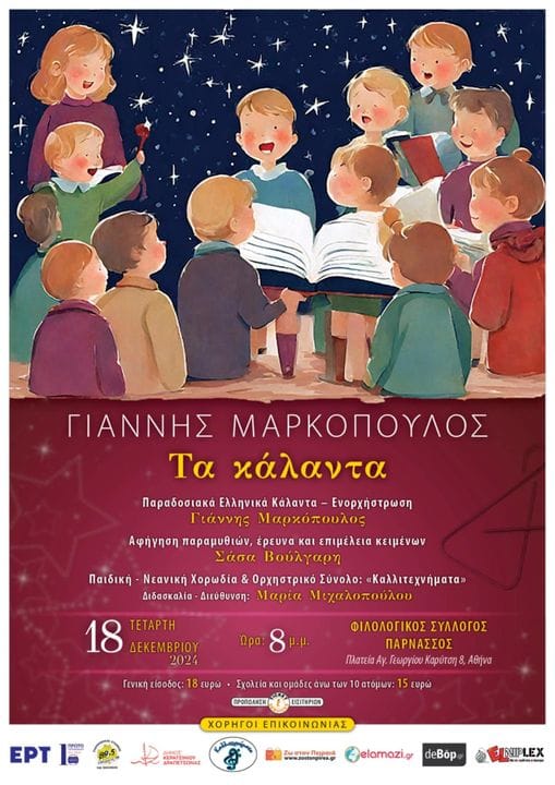 Ο μεγάλος μας συνθέτης Γιάννης Μαρκόπουλος μας άφησε ως δώρο πολύτιμο τη δική του μεταγραφή στα παραδοσιακά κάλαντα της Ελλάδας! Τα σταχυολόγησε, από άκρη σε άκρη, από τα Δωδεκάνησα, τον Πόντο, την Καππαδοκία ως την Κρήτη, την Μακεδονία, τη Θράκη, την Ήπειρο, την Πελοπόννησο και τα Επτάνησα, τα μελέτησε και τα ενορχήστρωσε για την εγγονή του και για όλα τα παιδιά του κόσμου! Για μία και μοναδική βραδιά Κάλαντα και Παραμύθια συναντιούνται στον Φιλολογικό Σύλλογο «Παρνασσός». Η γνωστή αφηγήτρια Σάσα Βούλγαρη αφηγείται συγκλονιστικά ελληνικά λαϊκά παραμύθια, γεμάτα περιπέτειες και καλικαντζάρους και μας ταξιδεύει με τη φωνή της σε εορταστικά έθιμα της Ελλάδας. Η μαέστρος Μαρία Μιχαλοπούλου διδάσκει και διευθύνει την Παιδική και Νεανική Χορωδία και το Ορχηστρικό Σύνολο «Καλλιτεχνήματα» για να αποδώσουν με σεβασμό και πιστότητα το έργο του μεγάλου Έλληνα καλλιτέχνη.