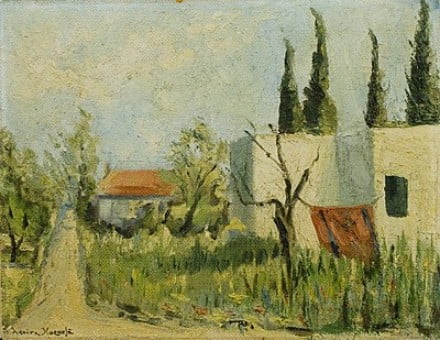Περιγραφή : Το βάρος της σύνθεσης βρίσκεται στην δεξιά πλευρά του έργου, με τα κυπαρίσσια να καλύπτουν όλο το ύψος του πίνακα, το σπίτι, το γυμνό δέντρο και το κόκκινο σεντόνι να δεσπόζουν και να αιχμαλωτίζουν την προσοχή. Ωστόσο, το κόκκινο των λουλουδιών, σε πρώτο επίπεδο, προτείνει και μια άλλη οπτική πορεία, οδηγώντας το μάτι στο κόκκινο του απλωμένου σεντονιού και κάνοντάς το να καταλήξει στην κόκκινη στέγη, στο κέντρο. Το φως αντανακλάται ρεαλιστικά στους υπόλευκους τοίχους του σπιτιού του πρώτου επιπέδου, ενώ η βλάστηση και ο δρόμος, που χάνεται στο βάθος, αποδίδονται περισσότερο με ιμπρεσιονιστικό τρόπο.
